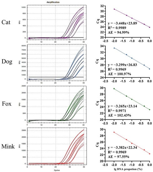 Three types of standard curves for cats, dogs, foxes, and minks were constructed. First, the genomic DNA of the cat, dog, fox, and mink was serially diluted with double-distilled water to 5, 0.5, 0.05, and 0.005 ng/μL as templates for UP-M-rtPCR. The Cq values were plotted against the logarithms of the DNA concentrations to create standard curves for each target species. Second, another type of standard curve for cats, dogs, foxes, and minks was constructed by plotting different weight proportions (5%, 0.5%, 0.05%, and 0.005% w/w) of each target species in binary meat mixtures vs. Cq values. The Cq values were plotted against the logarithms of the DNA concentrations to create standard curves for each target species. Finally, 50 ng/µL genomic DNA from cats, dogs, foxes, and minks was serially diluted with cattle DNA to different proportions (1%, 5%, 10%, 50%, and 100%) as the template for UP-M-rtPCR. Four standard curves were generated and used for quantitative detection of the DNA proportions of cats, dogs, foxes, and minks. The formulae of the standard curves and their R2 values were calculated.