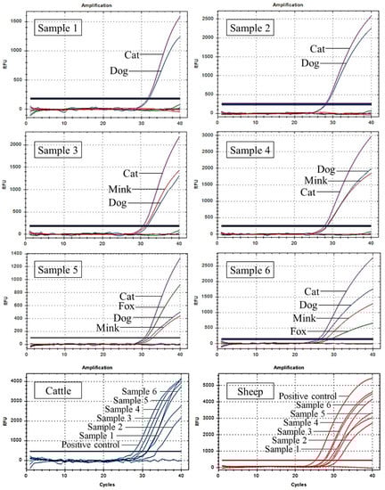 To test the applicability and accuracy of this method, six artificial meat samples with the meat of multiple target species were analysed using UP-M-rtPCR. As shown in Figure 7, all target species’ components incorporated in each artificial meat sample were detected simultaneously in one reaction. Even for an artificial meat sample containing only 1% of the four target species (sample 5), four independent fluorescence amplification curves were observed simultaneously, indicating that our method behaved well in a complex meat matrix. Moreover, the cattle- and sheep-derived ingredients in each artificial meat sample were also detected using previous methods [45,46]. All the test results for the artificial meat samples are presented in Table 3. The test results of the six artificial meat samples were consistent with the actual ingredients, suggesting 100% accuracy in the detection of cat, dog, fox, and mink fractions in artificial meat samples.