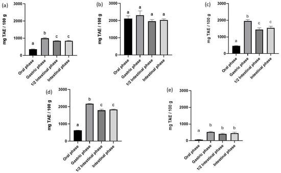 Total phenolic content (TPC) of in vitro digestion. TAE: Tannic acid equivalent. Data are presented as mean ± standard error of mean (SEM). (n = 3). Different superscript letters in columns indicate significant different data (p < 0.05). (a) hempseeds; (b) flowers; (c) hempseed protein extract; (d) soy protein extract; and (e) flaxseeds. End of oral phase, end of gastric phase, ½ intestinal phase, and end of intestinal phase.