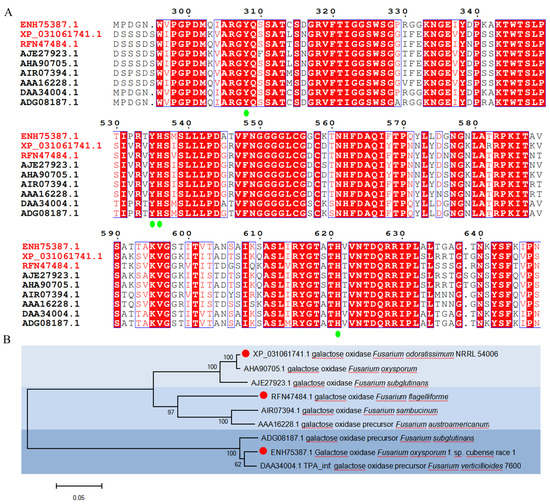 - Faria, C.B.; de Castro, F.F.; Martim, D.B.; Abe, C.A.L.; Prates, K.V.; de Oliveira, M.A.S.; Barbosa-Tessmann, I.P. Production of galactose oxidase inside the Fusarium fujikuroi species complex and recombinant expression and characterization of the galactose oxidase GaoA protein from Fusarium subglutinans. Mol. Biotechnol. 2019, 61, 633–649. [Google Scholar] [CrossRef] [PubMed]
