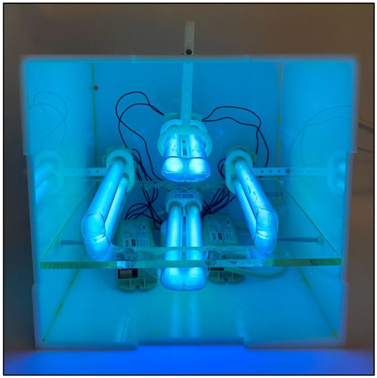 To validate the results of the microbiological quantification and ensure the accuracy of the shelf-life estimation, two shelf-life experimental runs were conducted for each meat type and storage condition, rustling in a total of 24 samples. Each was stored in a separate container. The samples in both runs contained the same meat cuts, weights, date of purchase, labeled expiry date, and preparation methods. For the experimental setups, four UV-C lamps (2G11, 253.7 nm, 18 W, Philips, Shanghai, China) were mounted on movable racks to expose the meat samples in the containers to light from the left, right, bottom, and top sides, as shown in Figure 1. The average distance between the samples and each light bulb was 2.45 cm and the exposure period was 30 s. A constant UV-C irradiation dose of 360 J/m2 was used in this study, and the UV-C light intensity was measured using an ultraviolet meter (Zenith, Atlantic Ultraviolet Corporation, New York, NY, USA). After the UV-C light exposure, the storage containers were vacuum-sealed using an a12-volt oxygen vacuum pump (JP1) until the pressure was reduced to 40 kPa. The oxygen levels in the vacuumed containers ranged between 1.7% and 1.8%, while they ranged between 20.7% and 21% in the containers that were not vacuumed, according to the AR8100 oxygen sensor.