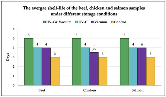Figure 2 shows the average shelf-life values that were achieved for the beef, chicken, and salmon fillets under different storage conditions. The results were mainly determined based on the mean values of the aerobic bacteria population counts that were illustrated in Table 1, Table 2 and Table 3, where the beef, chicken, and salmon samples were considered spoiled once they reached the expiration threshold of 106 CFU/g. Nevertheless, based on the Tukey HSD test results, there was a significant difference (p < 0.05) between the numerical superscripts on the expiration day and the day just before spoilage for all the samples, which indicates a rapid increase in the microbial growth rate; hence, the occurrence of microbial spoilage. It is worth mentioning that the indicated expiration dates of the control samples matched the dates printed on the packaging of each meat product, validating the precision of the microbiological examination and the results.