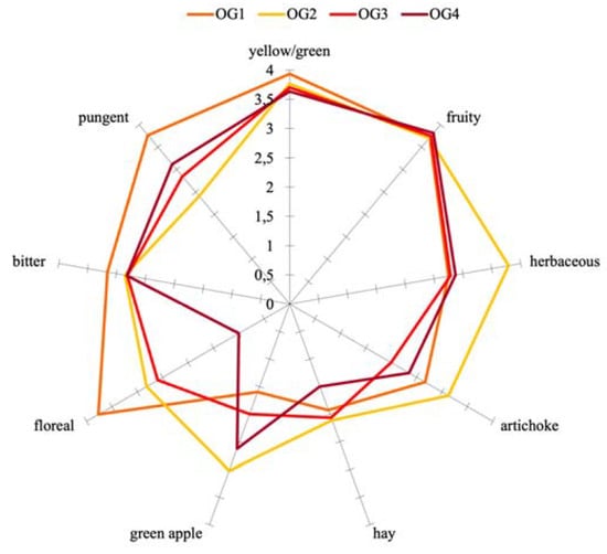 Sensory profile of Ogliarola olive oil obtained by adding three different concentrations of oxygen (0.2 L/min for OG2, 0.4 L/min for OG3, and 0.8 L/min for OG4) during crushing phase in comparison with control test (no oxygen added for OG1)