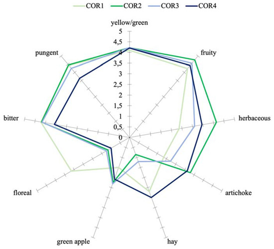 Furthermore, reading the PCA along the first component, it was observed a differentiation of the samples between those treated with oxygen during crushing (COR2, COR3, and COR4) and the control sample (COR1), the latter characterized by negative score values for this component (Figure 4). This difference was characterized by higher intensities of “hay” and “floral” in the control samples and a higher intensity of “yellow/green”, “fruity”, “green apple”, “herbaceous”, and “artichoke” in the treated samples. These results are in accordance with what was observed by the headspace analysis of the same samples, in which it was evident a higher concentration of volatile compounds such as 1-penten-3-ol, (E)-2-hexenol, (Z)-3-hexenol, and (Z)-3-hexenyl acetate, for the control oils and higher concentrations of (E)-2-hexenal for the treated oils, especially for COR2.
