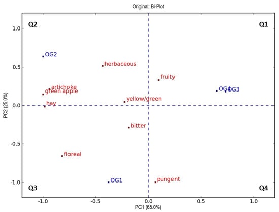 Additionally, from the bi-plot of this PCA model, it can be inferred that the location of the OG2 sample in the plot can be explained by the variables “green apple”, “artichoke”, “herbaceous”, and “hay”, while the control sample was related to the attributes “pungent” and “floreal.” This relationship was in accordance with the higher values of these sensory attributes for these two samples, as observed in Figure 1.