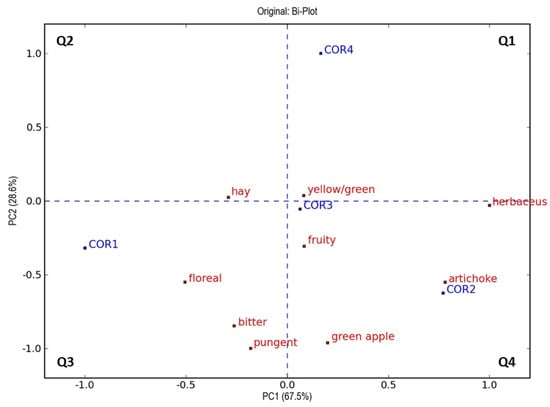 Representation of objects and variables (bi-plot) on the plane of the two principal components (PCA) relating to the results obtained through sensory evaluations of all virgin olive oils of cv. Coratina and the attributes evaluated. The variables and objects are marked in red and blue, respectively. The four quadrants are coded as Q1–Q4