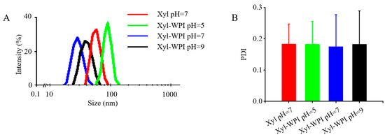 Particle size distribution and PDI value of different W/O emulsions. (A) Particle size distribution and (B) PDI value. Xyl W/O: Emulsion stabilized by PGPR; Xyl-WPI W/O: Emulsion stabilized by PGPR and WPI; pH refers to the pH value of internal aqueous phase.