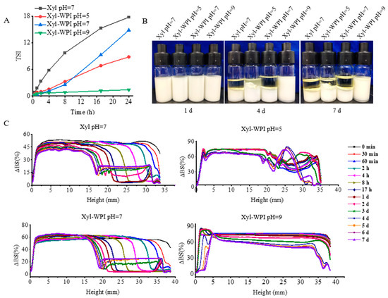 Global stability of different W/O emulsions during 7 days of storage at 25 °C. (A) TSI values of emulsions within 24 h. (B) The appearance of emulsions kept at day 0, 4, and 7. (C) Backscattering profiles (ΔBS) of emulsions within 7 days. Xyl W/O: Emulsion stabilized by PGPR; Xyl-WPI W/O: Emulsion stabilized by PGPR and WPI; pH refers to the pH value of internal aqueous phase.