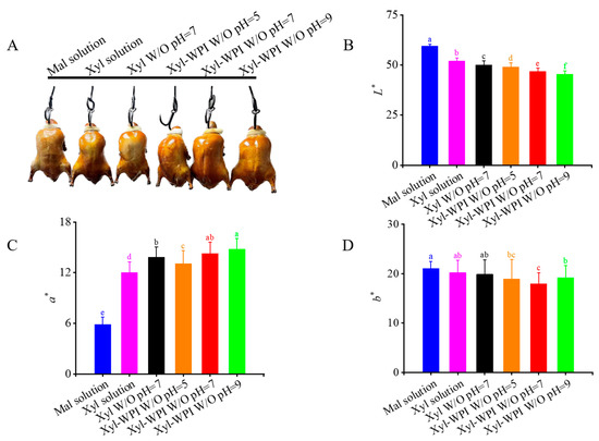 Color is often the first sensory characteristic and influential attribute which directly affects consumer preferences and desires. The formation of brown pigments contributes to the development of color. The color differences of Beijing roast ducks are presented in Figure 3. As shown in Figure 3A, after roasting, the duck in the maltose solution group showed the lightest color. In comparison, the xylose solution group and the Xyl W/O emulsion group showed a darker color, but it was not evenly distributed across the skin. However, the ducks in the Xyl-WPI W/O emulsion groups showed surprisingly attractive and uniform color, indicating that it optimized the Maillard reaction and improved the color tone.