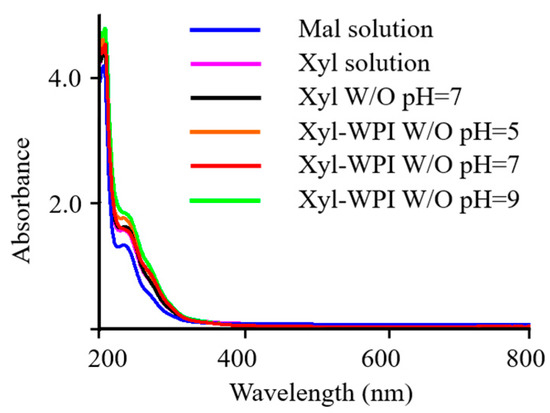 UV–vis spectroscopy of pigment containing structural information is shown in Figure 4. It shows that the absorption occurred between 200 and 400 nm, with a maximum absorption at 205 nm and a shoulder at about 235 nm, and the absorption decreased to the visible region. It was consistent with the data published by Hong et al., which showed a gradually increased absorption from 200 to 400 nm for brown pigments in Chinese sugar-smoked chicken [23]. The UV–VIS absorption spectrum of the pigment at 205 nm was also similar to that of melanin pigmentation [38]. Moreover, it could be seen that the absorbance in W/O nanoemulsion groups was higher than that in the solution groups, and Xyl-WPI emulsion at pH = 9 showed the highest absorbance at 205 nm, perhaps owing to accumulated pigmentation via the Maillard reaction.