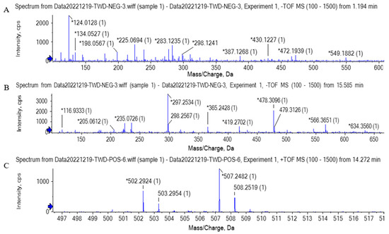 The primary mass spectrogram (MS) of compounds. (A) Compound 1 (m/z = 283.12), (B) compound 2 (m/z = 365.24), (C) compound 3 (m/z = 502.29).