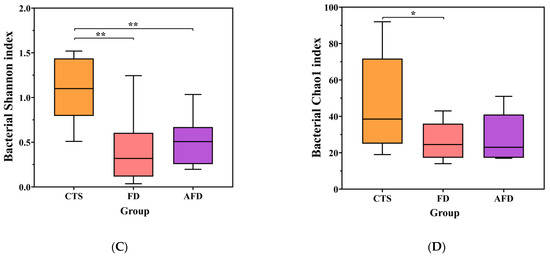 Microbial diversity indexes, including the Shannon and Chao1 indexes of CTS, FD, and AFD. (A) Chao1 index of fungi. (B) Shannon index of fungi. (C) Chao1 index of bacteria. (D) Shannon index of bacteria. * p < 0.05; ** p < 0.01.