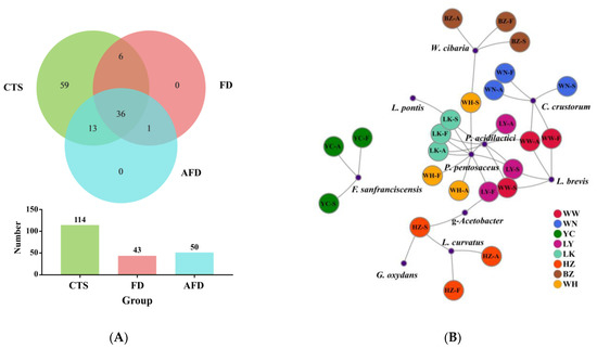 A Venn plot was used to analyze the similarity and specificity of bacterial species among the CTS, FD, and AFD groups (Figure 4A), indicating that the microorganisms in fermented doughs were almost all derived from CTSs and that adding alkali caused changes between the FD and AFD groups in the types of species originated from CTSs. Co-occurrence network analysis (Figure 4B) of bacterial communities in all CTSs and fermented doughs reflected the dominant species types and coexistence relationships among these samples. The dominant species in CTS, AFD, and FD samples from a given region were the same, indicating alkali addition did not change the types of dominant bacteria derived from CTSs. Ten species (Figure 3E,F) were identified in CTSs and fermented doughs: P. pentosaceus, C. crustorum, Pediococcus acidilactici, W. cibaria, F. sanfranciscensis, Levilactobacillus brevis, Latilactobacillus curvatus, Limosilactobacillus pontis, Gluconobacter oxydans, and Gluconobacter frateurii. P. pentosaceus and C. crustorum are usually found in fermented wheat flour products and demonstrated to be homofermentative LAB in sourdough, contributing significantly to the development of steamed bread flavor [25]. For example, Plessas et al. [26] clarified that P. pentosaceus was an efficient starter that improved bread quality and flavor by forming specific organic acids and volatile compounds. P. pentosaceus was present in the samples from LY, LK, HZ, and WH and predominated in LK and WH samples. C. crustorum was the most abundant species in WN samples; its relative abundance was decreased by adding alkali in fermented doughs. Comasio et al. [27] reported that C. crustorum could convert the citrate into L-lactic acid, acetoin, and diacetyl in sourdough and endow wheat bread with a buttery odor. In addition, W. cibaria and F. sanfranciscensis, which are also obligate heterofermentative LAB [25], dominated in samples from BZ and YC, respectively. The relative abundance of W. cibaria increased from 62.8% in CTS to 98.3% in FD from BZ, indicating that W. cibaria was highly competitive in this dough ecosystem. F. sanfranciscensis was a typical LAB in European type Ⅰ sourdough and the predominant species in CTS, AFD, and FD from YC, with relative abundances of >96.5%. L. pontis showed poor competitiveness in dough fermentation, with relative abundance in LK samples decreasing from 25.9% in CTS to 1.2% in FD.