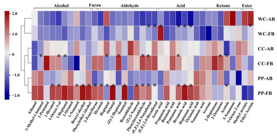 Comparison of volatile compounds in alkali-added and alkali-free CSBs fermented using synthetic microbial community starters. Pearson correlation with hierarchical clustering among the CSB samples was applied. WC-FB, CC-FB, and PP-FB indicate alkali-free CSBs fermented by synthetic microbial community starters containing Weissella cibaria, Companilactobacillus crustorum, and Pediococcus pentosaceus, respectively. WC-AB, CC-AB, and PP-AB symbolize alkali-added CSBs fermented by synthetic microbial community starters containing W. cibaria, C. crustorum, and P. pentosaceus, respectively. * p < 0.05.