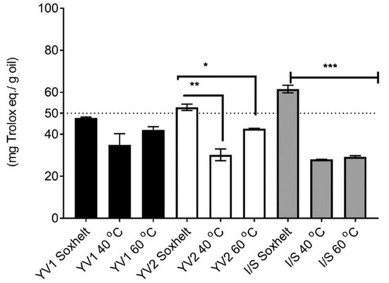 The antioxidant activity was equal to 47.78 ± 0.41, 34.96 ± 5.323, and 42.16 ± 1.452 mg Trolox eq./g oil in YV1 oil samples extracted by Soxhlet, SFE at 40 °C and 60 °C, respectively (Figure 3). Conversely, YV2 showed significant differences in the antioxidant activity depending on the extraction with 52.86 ± 1.526, 30.21 ± 2.78, and 42.67 ± 0.1718 mg Trolox eq./g oil for the Soxhlet, SFE at 40 and 60 °C samples, respectively.