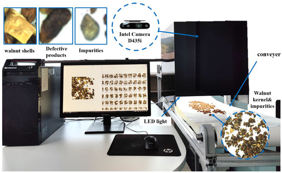 The image acquisition system has two functions: simulating the walnut processing line and take sample pictures. The system consists of a conveyor belt, aluminum profile, the computer, a camera (D435i from Intel, Santa Clara, CA, USA), a black inspection chamber, and an LED light belt [3]. The conveyor belt is divided into two stages: high speed and low speed. The density of the walnut kernel is changeable by controlling the speed difference of the conveyor belt. The camera is used to capture images with resolutions of 1920 × 1080 pixels. The color model is RGB. The camera is located 400 mm above the second conveyor belt [20]. The black inspection chamber, which was made by diffuse reflection plates, is set to cover the camera. Four equal power light belts (10 W each) are set in the black inspection chamber to provide light, as shown in Figure 1.