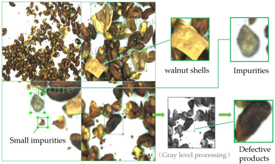 Food safety has always been a social health issue of great concern to people. Impurity pollution accounts for a large proportion of food pollution and is difficult to avoid [1]. Impurity pollution refers to the presence of other substances or foreign substances in food other than the food itself [2], which will cause physical and psychological harm to consumers. Taking walnut kernels as an example, impurities of walnut kernels can be divided into exogenous impurities (stones, metal parts, and plastic fragments) and endogenous impurities (walnut shells; spoiled walnut kernels) [3], which will seriously affect consumers satisfaction. Therefore, impurity detection is one of the important links to ensure the high quality of nut food [4]. In recent years, many researchers have tried to use imaging detection technology to detect impurities in food, including X imaging technology, terahertz detection technology, spectral detection analysis technology, machine vision detection technology, etc.