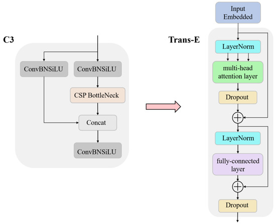 The Transformer was first used in the field of natural language machine translation, and its most significant feature is the self-Attention mechanism. The main working modules in the Transformer structure are the encoder and decoder. During machine translation, the encoder part models the input sequence. It extracts the output value of the last time step at the structural output as a representation of the input sequence. The decoder then takes the input sequence representation as its input value and generates the translation with maximum probability. This paper simulates the encoder function in the Transformer structure, and proposes a Transformer-Encoder (Trans-E) block and tries to apply it to the image impurity detection. The structure of the Trans-E block is shown in the Figure 5. The Trans-E block consists of two sub-layers, the multi-head attention layer and the fully-connected layer. Among them, the multi-head attention layer is to perform multiple linear mappings of different sub-region representation spaces through multiple heads under the consideration of parallel computing; thus, it can obtain more comprehensive information under different sub-spaces at different locations. The main function of theconnected layer is to map the feature space calculated by the previous layer to the sample label space. A residual structure connects the two sub-layers. This article replaces the bottleneck blocks and some Cnov blocks of CSPDarknet53 in the original YOLOv5 with Trans-E blocks. Compared with CSP bottleneck blocks, Trans-E blocks have more advantages in capturing global information.