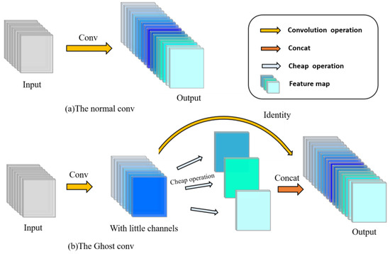 Different from traditional convolution blocks, GhostConv performs feature map extraction on images in two steps [24]. The first step is still using the normal convolution calculation, and the feature map channel obtained at this time is less. The second step uses cheap operation (depthwise conv) to perform feature extraction again to obtain more feature maps, and then concat the feature maps obtained twice to form a new output.