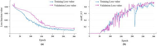 According to the data set type, the loss function of the prediction model can be divided into training loss and validation loss, and the curve is shown in the Figure 10a. It can be observed from the figure that in the process of model training, when the number of iterations is between 0 and 150, the training loss and validation loss decrease rapidly, and when the number of iterations reaches more than 250, the loss value of the prediction model begins to stabilize gradually. In this paper, the training model with 300 iterations is selected as the final walnut kernel impurity detection model. In addition, it can be observed from the mAP curves of the training set and the validation set in the Figure 10b that the trained prediction model does not appear to be overfitting.