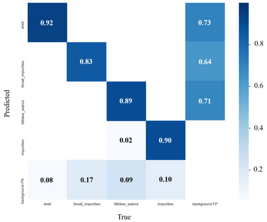 The confusion matrix can intuitively reflect the prediction results of classification problems, showing the prediction probability for each category. From the confusion matrix in the Figure 11, it can be observed that among the four types of impurities, the detection accuracy of the walnut shell is the highest, which can reach 92.21%, and the detection accuracy of small impurities is the lowest. Since impurities are located at the boundary of the image, the annotation information is accurate, resulting in a small part of the spoiled walnut kernels being predicted as other impurities.