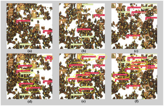 Comparison of the recognition effects of the YOLOv5 models. (a–c) recognition effects of the original YOLOv5; (d–f) proposed YOLOv5 network.