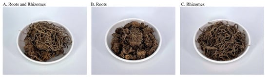 Dried underground valerian (V. officinalis) parts, including the roots and rhizomes (Figure 1), were harvested from Guizhou, China (longitude 108.83967, latitude 27.69956). Valerian was donated by KO DA Pharmaceutical Co. Ltd. (Taoyran, Taiwan, China). Foreign matter was removed using a 24-mesh sieve. The valerian samples were divided into four groups of 600 g each, and the roots and rhizomes were separated with scissors, milled, and sieved (<0.7 mm). Then, the samples were packed in laminated bags (PET/Al/LLDPE) and stored in a −25 °C freezer.
