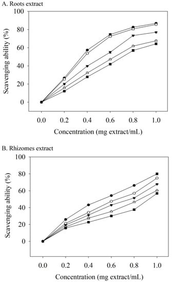 Roots extracts had better antioxidant properties, which may be attributed to the fact that the levels of phenolic compound in the roots extracts were higher than those in the rhizomes extracts (Table 2 and Table 3). Valerenic and acetoxyvaleric acid (0–250 μg/mL) were not able to scavenge the DPPH radicals in this study. The EC50 values (µg/mL) of ascorbic acid, BHA, and α-tocopherol in scavenging DPPH radicals were 15.67, 16.48, and 16.09, respectively. Valerian extracts were less effective than ascorbic acid, BHA, and α-tocopherol at DPPH scavenging, but these standards are additives that are used in foods or that are present at milligram levels. However, valerian extract can be used as a food supplement at the gram level.
