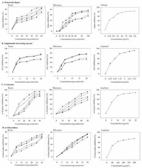 The inhibitory abilities of the extracts, phenolic acids, or valerenic acid derivatives; or orlistat, acarbose, or captopril solutions on lipase, α-amylase, α-glucosidase, and ACE were determined according to a previous study [,]. The lipase, ACE, α-amylase, and α-glucosidase inhibitory activities were expressed as the percentage of inhibition, and IC50 value (mg/mL) is the inhibition concentration at which enzyme activity was inhibited by 50%. Each analysis was carried out in quadruplicate. The analytical method is briefly described below. In the lipase inhibitory activity, 25 μL of extracts (roots 0–60 mg/mL and rhizomes 0–100 mg/mL), orlistat (0–125 ng/mL), phenolic acids (gallic, protocatechuic, and caffeic acids at 0–1.25 mg/mL; and chlorogenic acid at 0–2.5 mg/mL), valerenic acid derivatives (0–2 mg/mL) dissolved in 5% DMSO solution, were incubated with 50 μL substrate and 25 μL lipase (150 U/mL) for 30 min at 37 °C. The supernatant of the reacted solutions was read at 405 nm using an ELISA reader. Orlistat was used as a positive control.