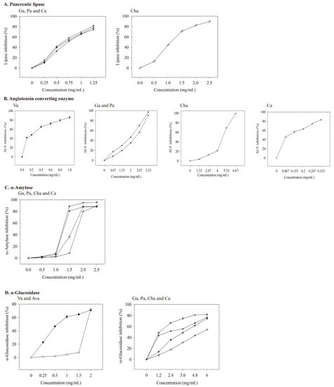 MS is a group of syndromes that increase the risk of coronary heart disease, diabetes, stroke, and other serious health problems []. At least one-quarter of the world’s population have MS, with massive annual healthcare costs, causing a loss of productivity in the workforce []. A healthy lifestyle to maintain an ideal body weight could prevent MS, and medications are available to treat MS; however, medicines have side effects, which also increases healthcare costs. Therefore, finding natural substances that can modulate MS is important. Systematic review and meta-analysis revealed that green tea, phaseolus vulgaris, garcinia cambogia, nigella sativa, and ferulic acid have an effect on metabolism syndrome-related enzymes [,,]; among them, ferulic acid [] and garcinia family [] are phenolic acids. This study investigated the extraction yield and bioactive compounds of lyophilized extracts from the underground parts (roots and rhizomes) of V. officinalis. Further, the inhibitory effects of the extracts on the specific MS-related enzymes activities were examined: pancreatic lipase, ACE, α-amylase, and α-glucosidase.