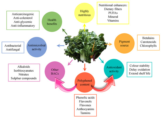 The most common BACs identified in edible leafy vegetables are dietary fiber, minerals, phenolic compounds, phytic acid, phytoestrogens, polyunsaturated fatty acids (PUFAs), sulfur compounds, terpene derivatives, and vitamins [2]. Many of these BACs are antioxidant molecules with potential applications mainly in the food and nutraceutical industries (Figure 1). This is the case of polyphenols, whose ability to scavenge free radicals makes them also associated with numerous health benefits (e.g., anticarcinogenic, anti-cholesterol, anti-inflammatory, anti-glycemic, antimicrobial, and antimutagenic properties) [1]. The antioxidant activity of these compounds is mainly associated with their ability to neutralize highly reactive oxygen species (ROS) and reduce oxidation processes [3]. For all these reasons, the natural antioxidants obtained from leaves could replace the use of synthetic compounds, since some of them are even more effective and are not associated with adverse reactions.