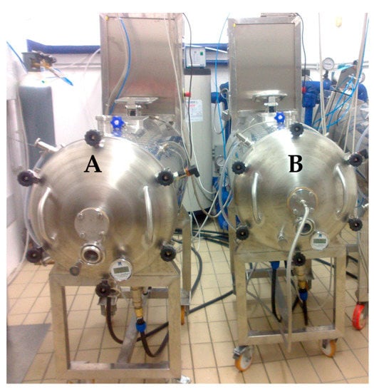 Figure 1. Rotary wine fermenter pilot plants: (A) control; (B) with ultrasound system.