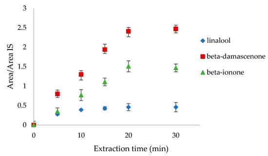 Figure 2. Extraction time tests on linalool, β-damascenone, and β-ionone at 5, 10, 15, 20, and 30 min.