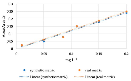 Finally, the matrix effect was evaluated using regression lines of linalool, nerol, β-citronellol, and β-damascenone in a synthetic and in a real matrix. These four compounds were chosen for their wide hydrophobicity range (from 2.97 to 4.29 log P) and because they are subject to a matrix effect in connection with the cultivar, as reported by Rodríguez-Bencomo et al. [33] in a study on young Beaujolais and oak-aged Tempranillo red wines. No differences were found in the regression line slopes between the synthetic and real matrix for all four compounds, as shown for nerol in Figure 3. Therefore, according to the Student’s t test, no matrix effect was observed.