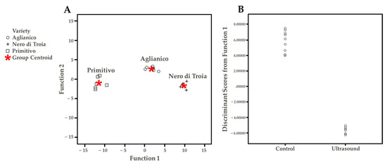 Figure 4. (A) Discriminant function plot considering wine cultivar. (B) Discriminant function plot considering the treatment.
