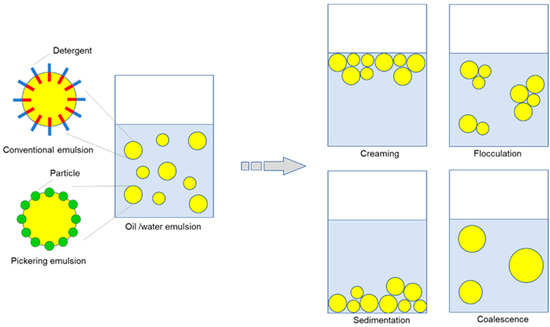 Stabilization of emulsion-based colloidal structures by food ingredients has attracted attention in the food and pharmaceutical, as well as cosmetic, industries [79]. In the Pickering emulsion [80,81], solid particles are adsorbed onto the interface between the two distinct phases, such as oil and water, and inhibit emulsion droplets from coalescence (Figure 2). Stabilizing the oil/water boundary by plant-based materials such as proteins and organelles is useful in exploring emulsion systems in developing new foods [82]. Examples include egg-free mayonnaise [83], barley-based non-dairy milk [84], probiotic encapsulation [85], as well as additive-free, gluten-free rice bread [86]. However, these bio-based emulsions tend to be unstable due to gravity-induced separation (creaming/sedimentation), flocculation, and coalescence (Figure 2).