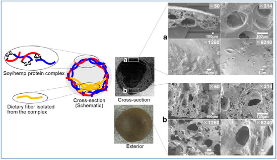 The outer shell is made of the mixture of soy/hemp proteins which are linked with intermolecular disulfide bonds. Dietary fiber, isolated from the protein complex, is located in the bottom of the ball. Thus, the ball has a low center of gravity and behaves like a “roly-poly” wiggle ball. In this case, hemp protein, rich in free SHs [63,66], is considered to work as a SHs donor, as egg white protein worked as a donor of free SHs in the bread made of egg white/soy protein isolate [73]. Electron microscopic observation of the protein-rich outer shell (Figure 3a) and fiber-rich inner bottom part (Figure 3b) reveals distinct structures. The former has a dense structure while the latter has a reticulated structure with small void spaces. Contribution of the unique structure to the ball’s texture is being investigated by sensory evaluation in our lab. Conclusively, application of hemp protein on food processing will broaden the variation of the food products.