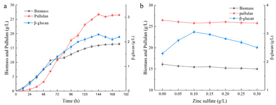 Effects of fermentation time (a) and ZnSO4 additive amount (b) on A. pullulans ’s biomass, pullulan yield, and β-glucan yield.