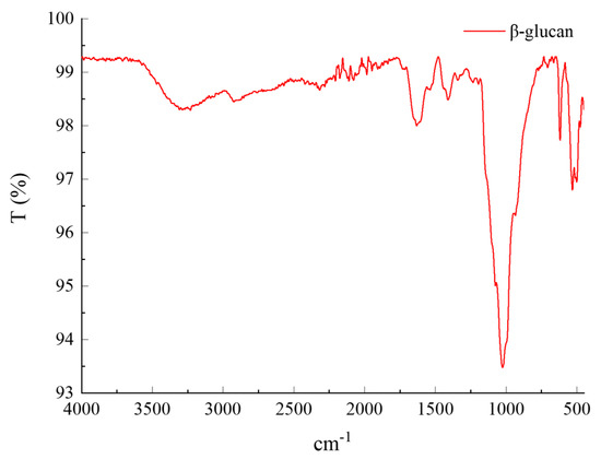 The structure of obtained products was characterized by infrared spectroscopy, and the results are shown in Figure 2. The peaks at 3312 cm−1 and 1422 cm−1 are the stretching vibrations of carbohydrates’ intermolecular and intramolecular -OH and C-OHs. The characteristic peak of the C-H bond is at 2925 cm−1 [23]. Moreover, the three characteristic peaks at 1601 cm−1, 1161 cm−1, and 1015 cm−1 are vibrations of O-C-O, C-O-C, and C-O [24]. The most crucial characteristic peak is at 890 cm−1, a characteristic absorption peak of the β glucosidic bond, indicating that the isolated carbohydrate is β-glucan [25].