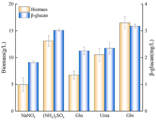 Different nitrogen sources (NaNO3, (NH4)2SO4, Glu, Urea, Gln) were used in the fermentation mediums for culturing A. pullulans. The biomass and β-glucan yield were measured according to the method described in Section 2.2, and the additive amount of different nitrogen sources was calculated based on the nitrogen contained in 0.6 g/L(NH4)2SO4.