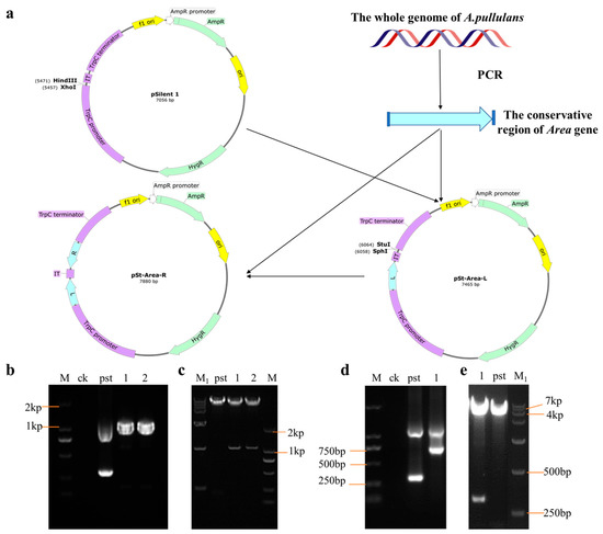 Construction and validation of Area silencing vector. (a) Construction strategy of Area silencing vector; (b) PCR validation of pSt-Area-R vector, ck is water, pst is empty vector, 1 and 2 are pSt-Area-R; (c) validation of double digestion (StuⅠ and XhoI) on pSt-Area-R vector, pst is pSilent1 vector, 1 and 2 are pSt-Area-R; (d) PCR validation of pSt-Area-L vector (primer PSR/PSF), ck is water, pst is pSilent1 vector, 1 is pSt-Area-L; (e) validation of double digestion (HindⅢ and XhoⅠ) on pSt-Area-L vector, pst is empty vector, 1 is pSt-Area-L.