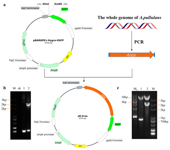Construction and validation of overexpression vector. (a) Construction strategy of Area overexpression vector; (b) PCR validation pf pB-Area vector, ck is control, 1 is empty vector, 2 is pB-Area; (c) validation of double digestion (BamHⅠ and XhoⅠ) on pB-Area vector, 1 is empty vector, 2 is pB-Area.