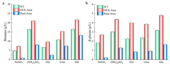The regulation of nitrogen metabolite repression is an important mode to guarantee the efficient use of nitrogen sources by fungi. After 6 days of culturing, we found that the biomass of the overexpressed Area strain improved significantly under inorganic and organic nitrogen sources. With the favorable source Gln, the biomass reached its highest value of 21.6 g/L (Figure 6). However, the biomass decreased significantly after silencing the Area gene, particularly when NaNO3 and Glu were the nitrogen sources. The reason is that as the activator of nitrogen repression, Area can activate related genes downstream, relieving nitrogen metabolite repression [21]. In terms of β-glucan, it showed the same trend as biomass, suggesting that as a global regulatory gene, the Area gene can also regulate the synthesis of β-glucan. Further studies are required to determine whether the control is direct or indirect.