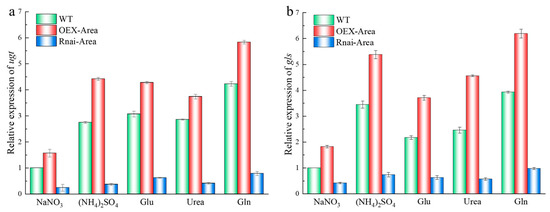 As a glycosyl transferase, UGT can prolong the β-glucan chain, and β-1,3 glucan synthase (GLS) plays a key role in the synthesis of β-glucan, cell wall assembly, and fungi growth [28]. After culturing with various nitrogen sources, A. pullulans and its mutant strains, the expression quantity of UGT and GLS are shown in Figure 7. The expression of UGT is significantly different when comparing Gln with NaNO3 as the nitrogen source of WT (Figure 7a). In terms of GLS expression, it was higher when (NH4)2SO4 and Gln were used as nitrogen sources (Figure 7b). However, the expression of UGT and GLS significantly decreased after Area silencing. In contrast, the expression increased again after overexpression of Area, the same as the previous finding of β-glucan yield changes.