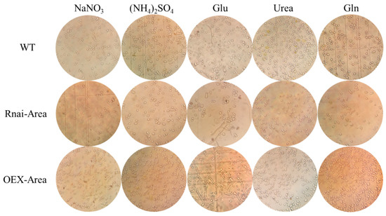 After 6 days of culturing in different nitrogen source mediums, 10 μL fermentation liquor was collected from the wild-type and mutant strains, respectively. These liquors were observed and photographed under a light microscope. The wild-type and mutant thallus were collected by centrifugation and fixed with 50% glutaraldehyde for 30 min after 3–5 times washing with distilled water, followed by dehydration with 50%, 75%, 80%, 90%, 95%, and 100% ethanol, respectively. All samples were treated with acetone afterward, then freeze-dried and placed on conductive tapes for observation under a scanning electron microscope.