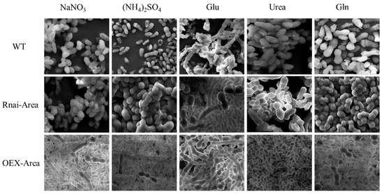 In the presence of organic nitrogen Urea, the optical microscopy observed that most cellular morphologies were typically yeast-like in both WT and mutant strains. A few were swollen cells and chlamydospores, with no hypha existing (Figure 8). However, after the scanning electron microscope discovered the silencing Area, the number of chlamydospores and yeast-like cells was comparable. In contrast, the yeast-like cells became the major morphology after Area was overexpressed (Figure 9). After culturing with the preferred organic nitrogen Gln, the major morphologies of the WT strain observed in microscopy were swollen cells and chlamydospores, whereas silenced and overexpressed transformants showed the dominance of chlamydospores and swollen cells, respectively (Figure 8 and Figure 9). After culturing with Glu, the cell morphology of WT and silencing strain was increasingly diversified: yeast-like, swollen cells, chlamydospores, and hyphae. However, the number of hyphae outweighed other morphologies when Area was overexpressed (Figure 8 and Figure 9). After culturing with inorganic NaNO3, the primary morphologies of the WT strain were chlamydospores and swollen cells, whereas swollen and yeast-like cells were dominant after silencing and overexpression of Area. In addition, hyphae appeared in the overexpressed strain (Figure 8 and Figure 9). Last, under the culturing of preferred inorganic nitrogen (NH4)2SO4, the dominant morphology in the WT strain was chlamydospores. Swollen cells and chlamydospores dominated the silencing strain, and yeast-like cells dominated the overexpressed strain (Figure 8 and Figure 9). Furthermore, considering the morphology of the mutant strains at these nitrogen sources and β-glucan yield, we realized that yeast-like and swollen cells are responsible for producing β-glucan. Therefore, as the key transcriptional activator, GATA transcription factor Area can not only regulate the absorption and utilization of nitrogen sources but can also significantly regulate the cell morphology of A. pullulans.