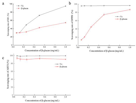 Antioxidant activity of β-glucan. (a) The clearance rate of β-glucan on OH·; (b) the clearance rate of β-glucan on DPPH·; (c) the clearance rate of β-glucan on ABTS·.