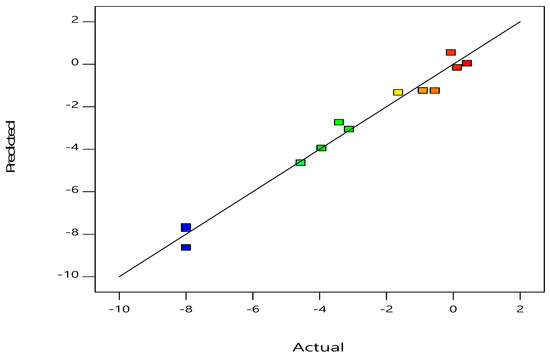 An adjusted R2 value (0.9485) of the suggested model validates its accuracy. Taking into account the noise ratio, with the value of 16.9018 (Adeq Precision), it is considered as an appropriate response ratio and high accuracy. The model’s precision can be indicated, which should be greater than 4 [27]. The coefficient of variation (CV% = 21.57%) and Adequate Precision (Table 2) were also noted as indicators of its reliability. Compared with previous reports that compared the model’s accuracy with the predicted values, it was able to produce reproducible results [20,28].
