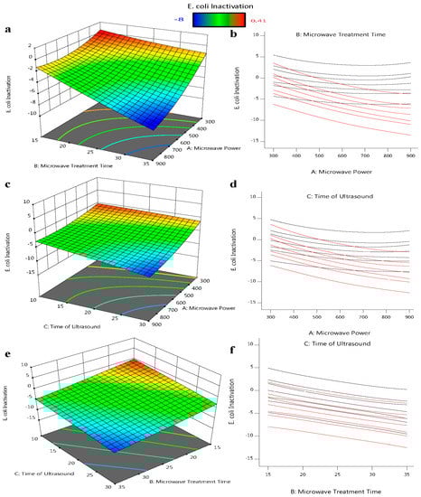 Three-dimensional response surface plots showing the influence of process factors on E. coli ATCC 25922: (a,b) the microwave treatment time and microwave power intersection; (c,d) the time of ultrasound and microwave power intersection; and (e,f) the time of ultrasound and microwave treatment time intersection for E. coli reduction.