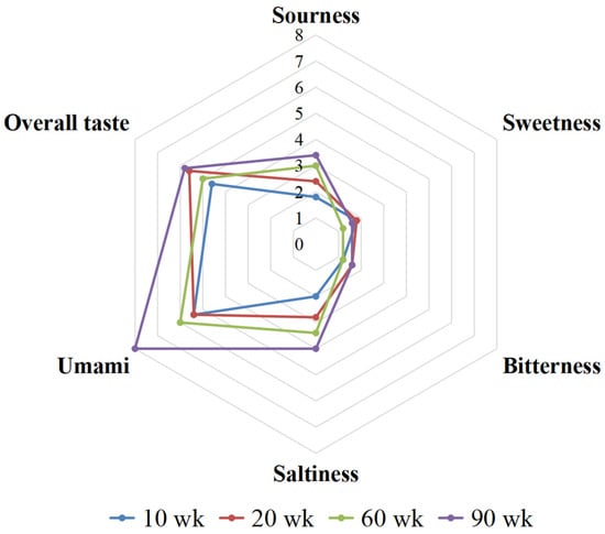 The sensory evaluation results of the 10, 20, 60, and 90 wk soup samples are shown in Figure 1 and Table S4. It can be seen that the four soup samples were mainly tasted as umami, salty, and sour, with umami being the strongest. This result was confirmed by our previous study that chicken breast soup was dominated by an umami taste [12]. The higher accumulation of 5′-IMP in Type IIB muscle fibers and its synergistic effect of free amino acids might be one of the reasons for the prominent umami taste of breast meat [16]. As shown in Table S4, the sweetness and bitterness of the four soup samples were low intensity and had no significant effect at the different ages of the chicken. The scores of sourness and saltiness increased with chicken age, with the highest scores for both being observed in the 90 wk soup samples. The umami and overall taste of the four soup samples were generally positively correlated with the age of the chicken. Notably, the umami intensity of the 90 wk soup was significantly higher than that of the 10 and 20 wk soup samples, which might be the reason that consumers preferred to choose aged chicken to prepare chicken soup. The umami and saltiness were also considered as the dominant taste of Sanhuang old hen (Chinese native chicken) soup in a previous study by Liang et al. [15].